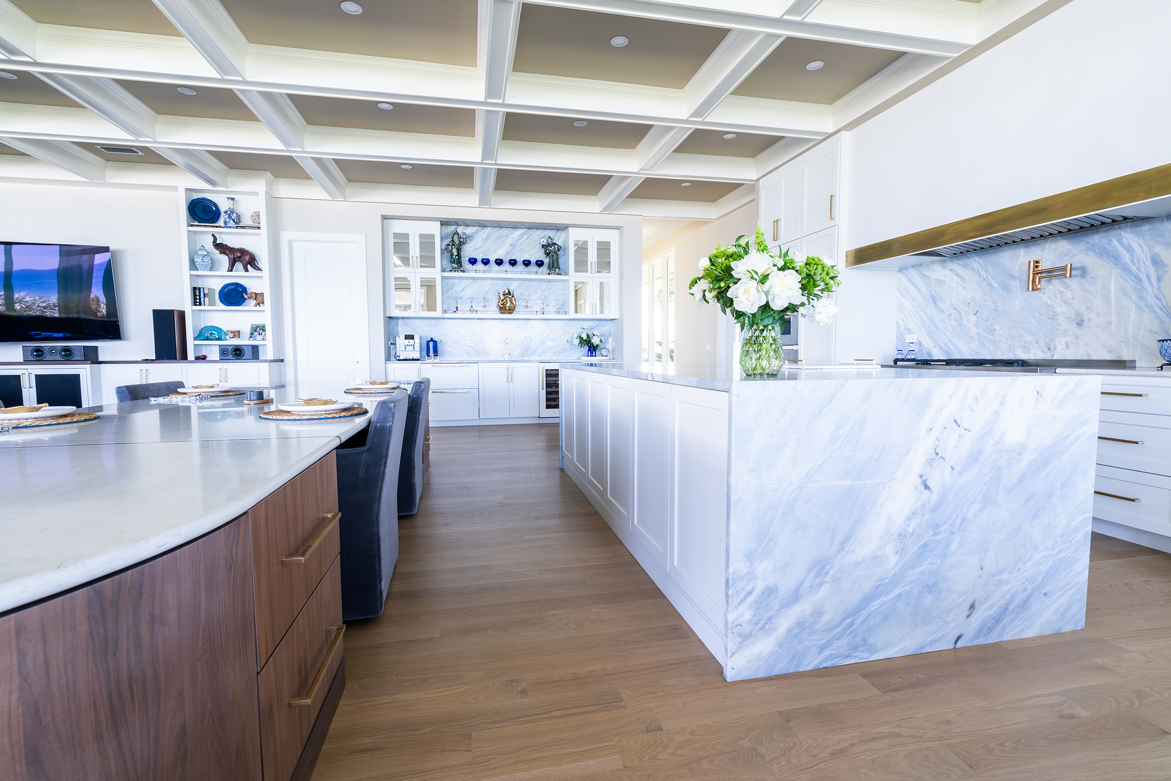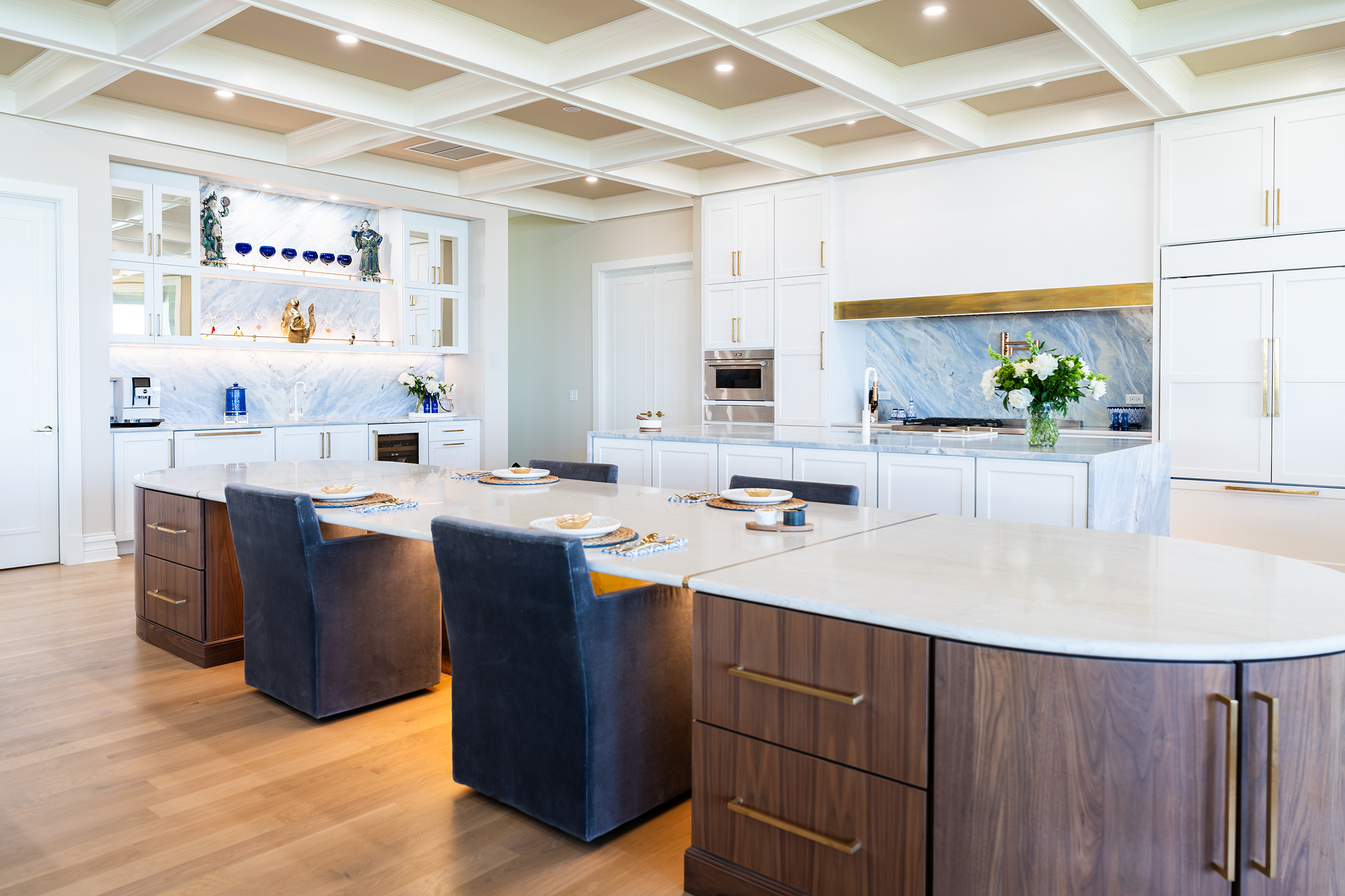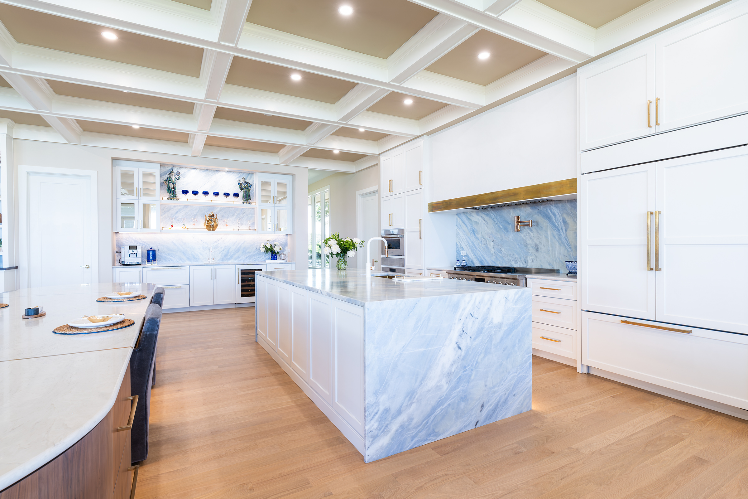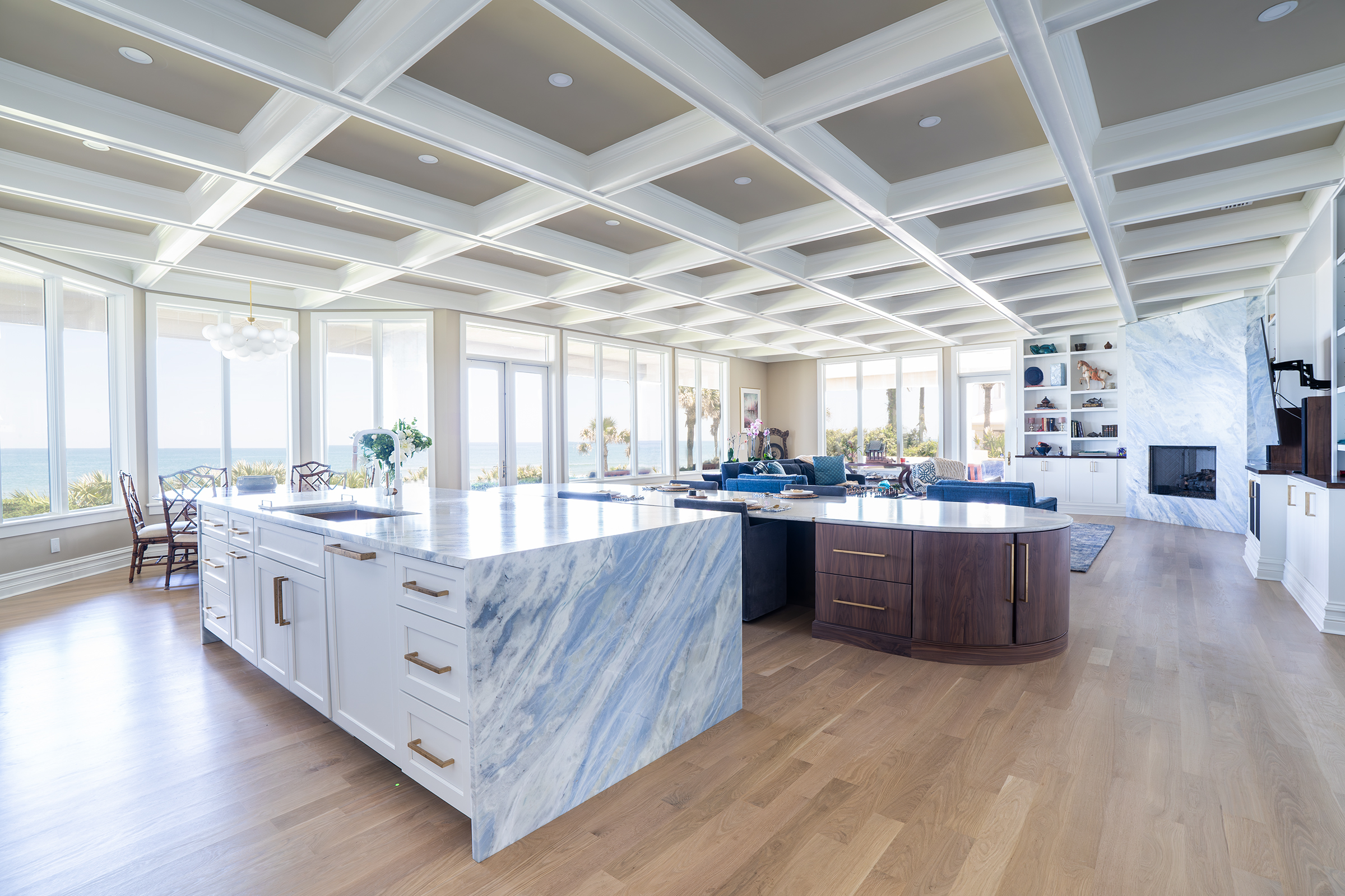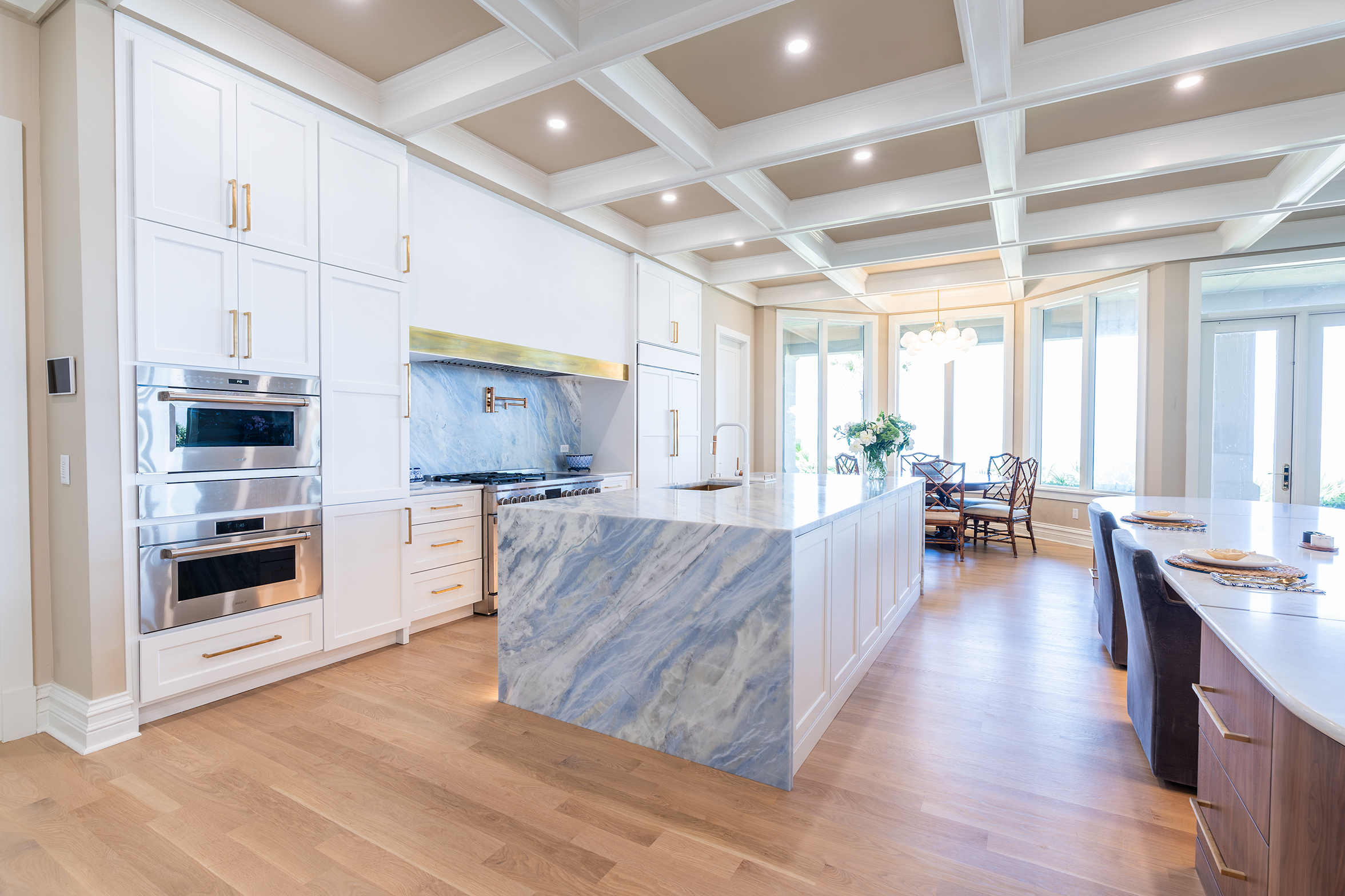 Ponte Vedra Beach Oceanfront Kitchen OverviewDouble Island with BarWet BarDouble Island OverviewWaterfall Island, Bar and CabinetryCabinetry and Plaster Hood Front ViewDouble Oven, Plaster Hood and Waterfall Island Side ViewIsland SeatingWalnut Island with Brass OverlayUndermount Sink with FaucetDish Peg OrganizerCutlery Silverware Tray Related