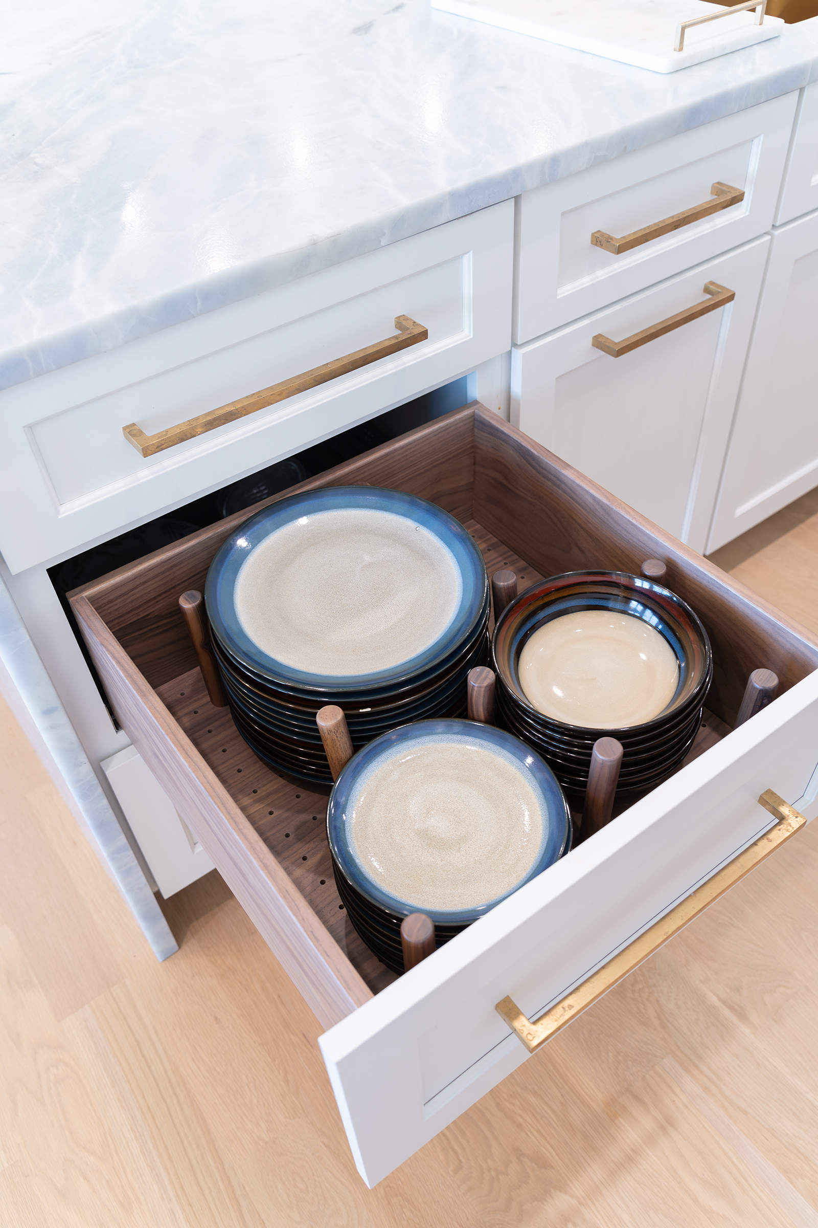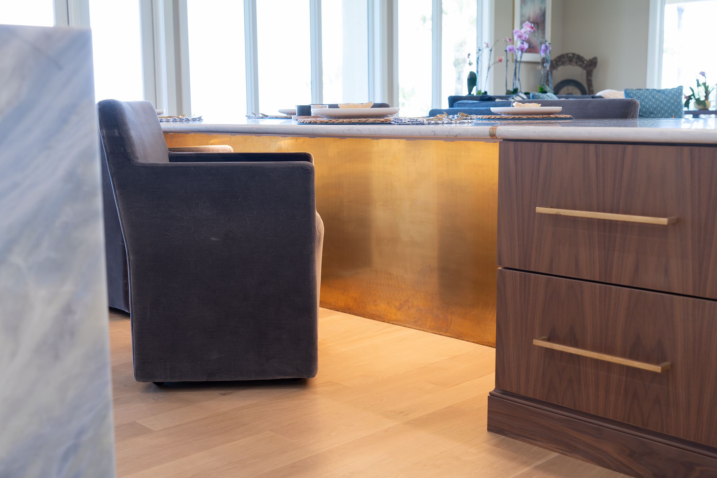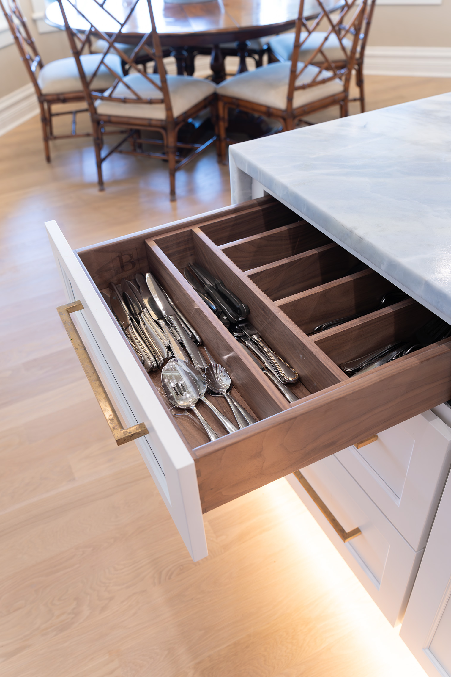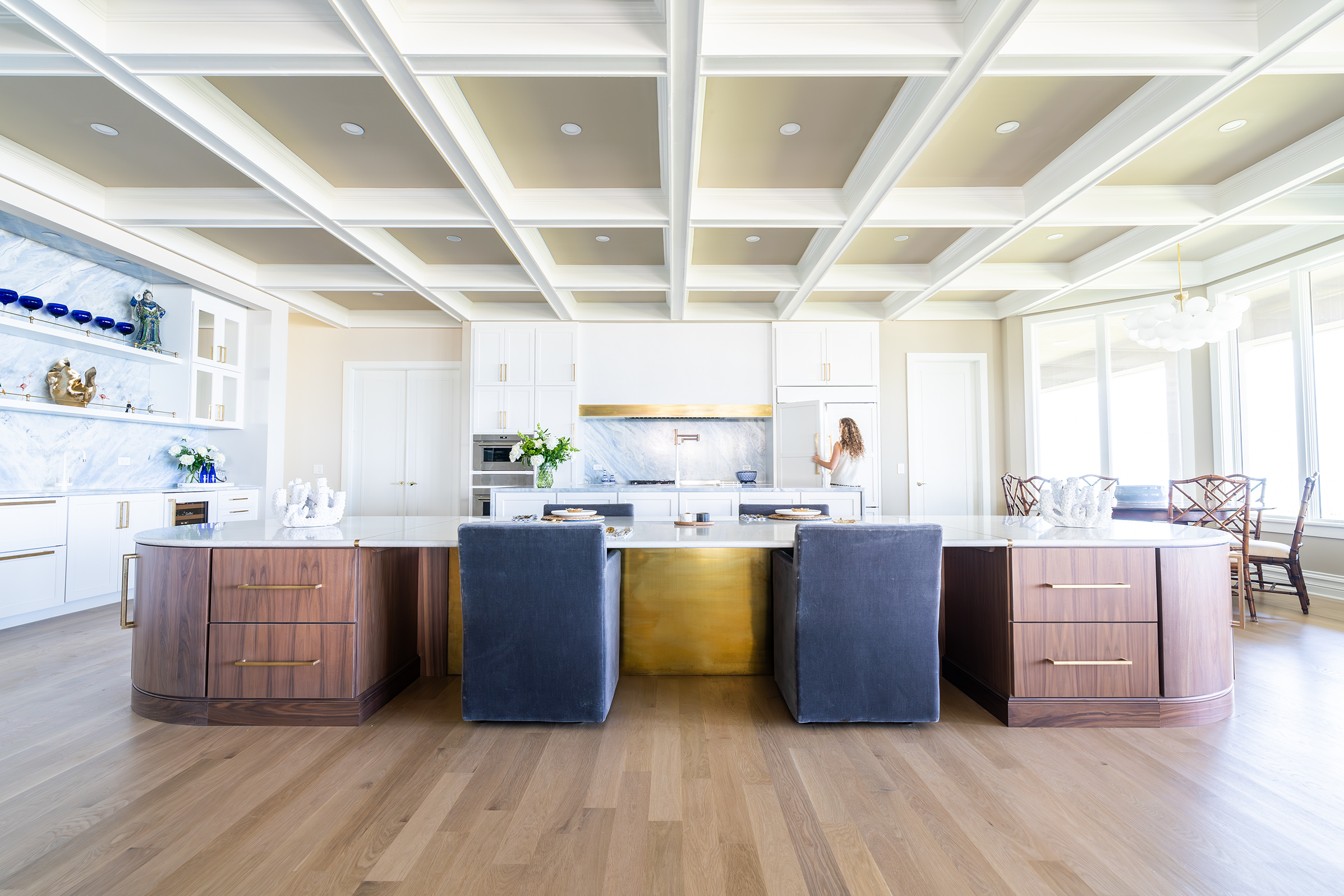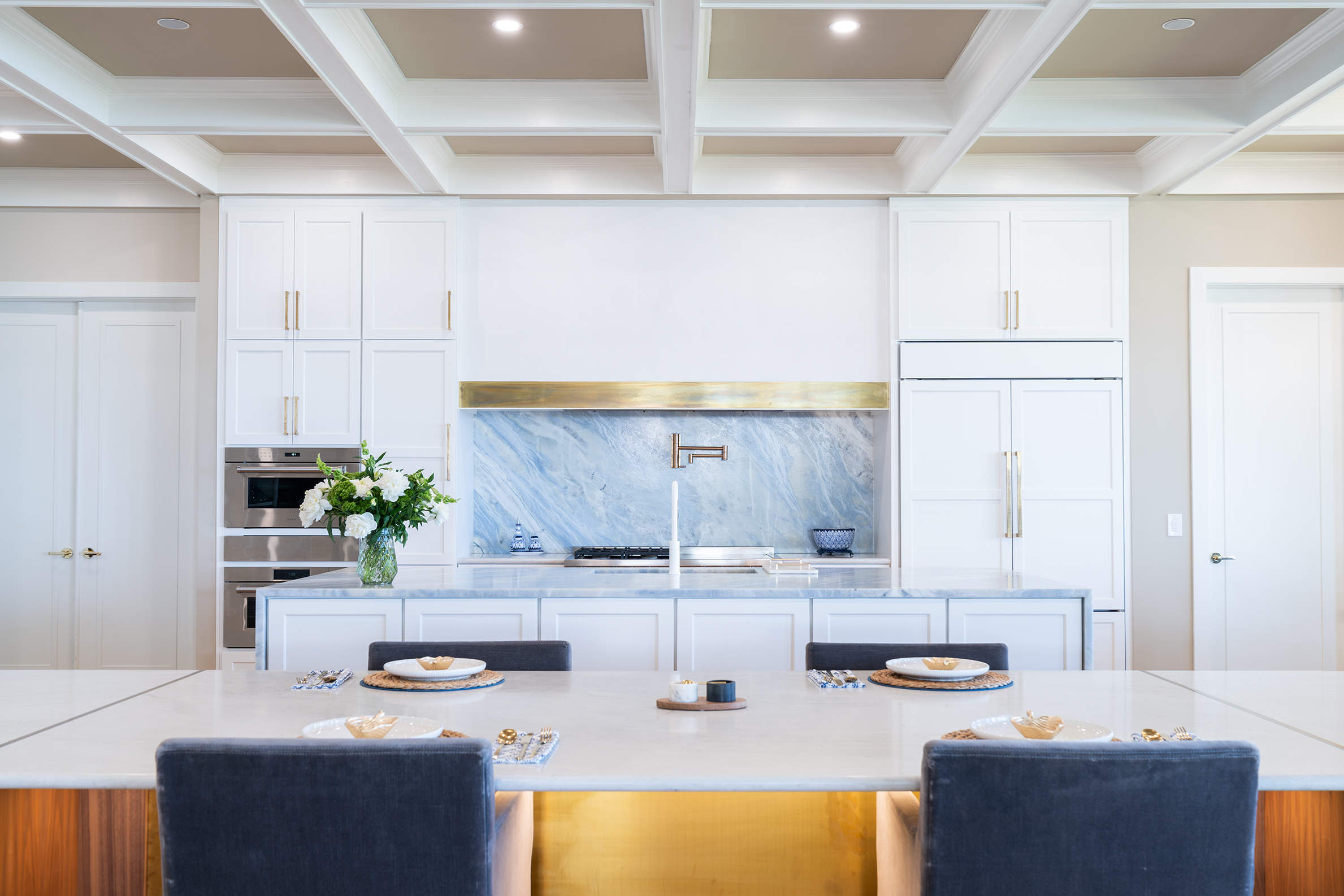 Ponte Vedra Beach Oceanfront Kitchen OverviewDouble Island with BarWet BarDouble Island OverviewWaterfall Island, Bar and CabinetryCabinetry and Plaster Hood Front ViewDouble Oven, Plaster Hood and Waterfall Island Side ViewIsland SeatingWalnut Island with Brass OverlayUndermount Sink with FaucetDish Peg OrganizerCutlery Silverware Tray Related